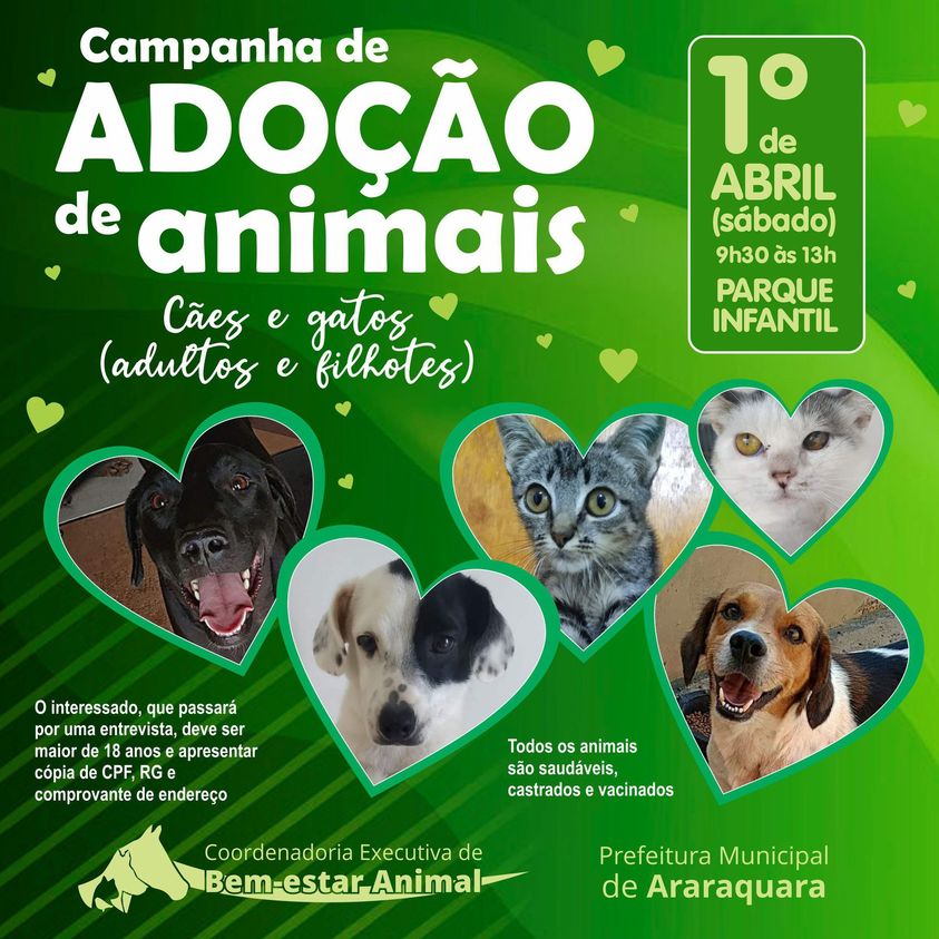 Campanha de Adoção de Animais no Centro de Adoção Permanente Cão Gabriel acontece neste sábado em Araraquara