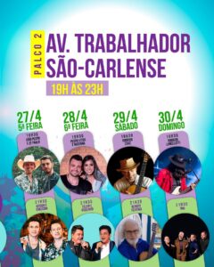 Haverá contação de histórias, apresentação de dança, e shows musicais de diversos estilos, envolvendo artistas locais e outros de renome nacional, como Renato Teixeira, Cezar e Paulinho e Ira!, que irão se apresentar em um palco montado na Avenida Trabalhador Sãocarlense, próximo ao pontilhão da Avenida São Carlos e ao Terminal Rodoviário.
