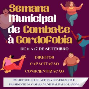 “Diariamente, pessoas gordas enfrentam desafios de todos os tipos: transporte público, restaurantes e outros ambientes que não estão preparados para acomodá-las. Ainda pior: sabem também que serão alvo de piadas, julgamentos e ouvir de muita gente que precisam emagrecer”, disse Landim, acrescentando que “esta lei tem por objetivo dar visibilidade à discriminação e ao estigma social enfrentado por pessoas gordas, a fim de garantir seu direito à cidadania, saúde integral, educação inclusiva e ao trabalho. Tudo isso está sendo tratado nessa semana e eu quero convidar toda a população a participar”.