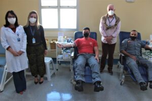 13 de julho de 2021 – O Banco de Sangue da Santa Casa de São Carlos recebeu nesta terça-feira (13) as doações do Capitão Rangel Moreira Gregório, Comandante do 4º Subgrupamento de Bombeiros do 9º Grupamento de Bombeiros, e dos Cabos Abimael Gonçalves Ramos, Luciano Rodrigo Marques de Souza e Elsio de Andrade. As doações de sangue dos quatro bombeiros dão início à Campanha Bombeiro Sangue Bom em São Carlos.