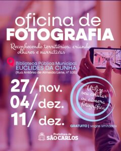 O minicurso de fotografia, com três encontros de 2h de duração cada um, será ministrado pelo fotógrafo Diogo Martino Fernandes Almeida. A formação tem como público alvo crianças, a partir dos 7 anos, adolescentes e adultos. Os interessados devem levar o celular ou câmera fotográfica. As inscrições podem ser feitas na própria Biblioteca Euclides da Cunha ou através do telefone (16) 3374-3084.