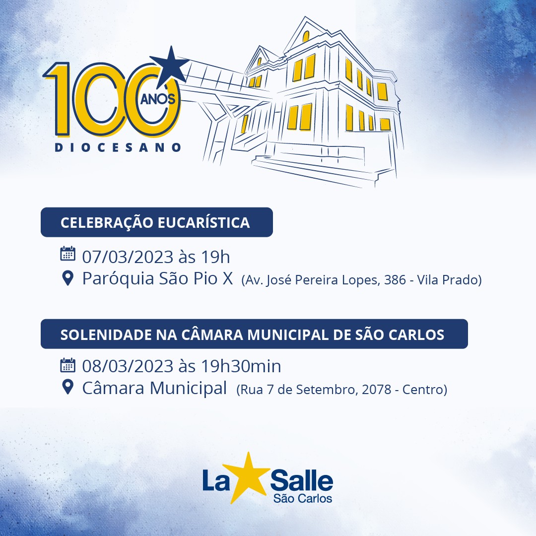 A Câmara Municipal de São Carlos realiza amanhã, às 19h30, uma sessão solene em comemoração ao Centenário do Colégio Diocesano La Salle São Carlos. A sessão será presidida pelo vereador Gustavo Pozzi, e terá o vereador Azuaite como orador.