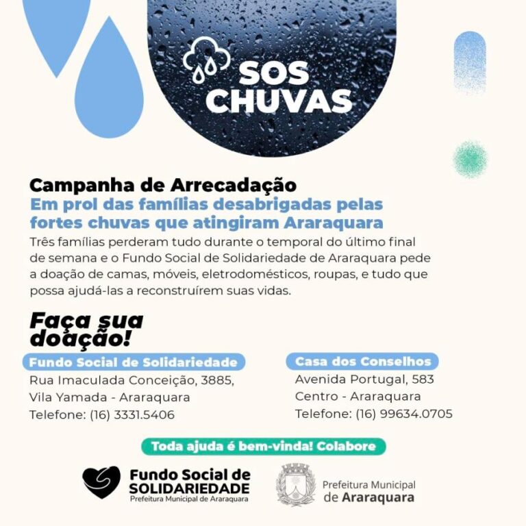 O Fundo Social de Solidariedade de Araraquara realiza uma ação em prol das vítimas das fortes chuvas que atingiram a cidade na última sexta-feira (27). De acordo com a Defesa Civil, foram 49.8mm de chuva em 50 minutos, o que resultou em diversas ocorrências pela cidade. Na Avenida Professor Jorge Corrêa, nas proximidades da região […]