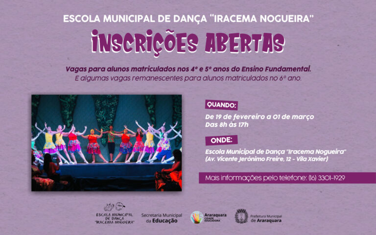 Estão abertas as inscrições para a Escola Municipal de Dança Iracema Nogueira de Araraquara para o ano letivo de 2024. O curso oferecido pela Prefeitura de Araraquara, por meio da Secretaria Municipal da Educação, é totalmente gratuito. São 175 novas vagas destinadas a alunos matriculados nos 4º e 5º anos do Ensino Fundamental para acesso […]