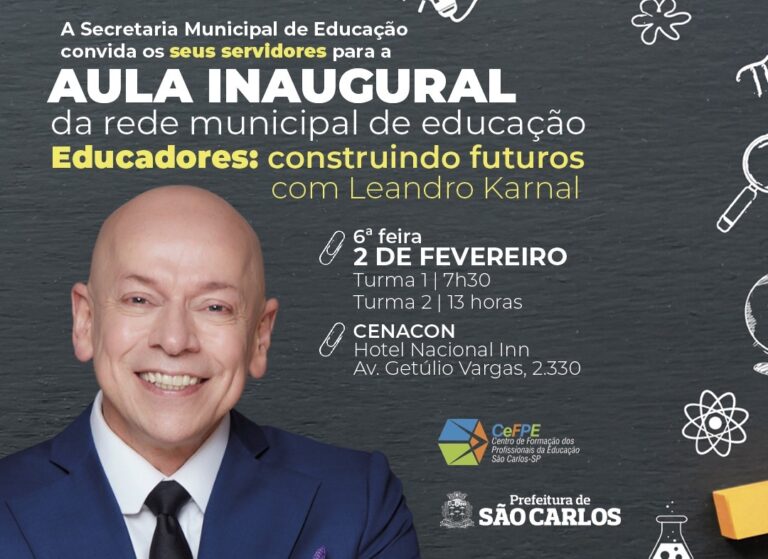 A Secretaria Municipal de Educação de São Carlos vai realizar no próximo sexta-feira (02/02), às 7h30, no anfiteatro da CENACON, no Hotel Nacional Inn, o acolhimento de todos os profissionais da rede municipal de ensino, incluindo professores da Educação Infantil, do Fundamental I, do Fundamental II, da Educação de Jovens e Adultos (EJA), merendeiras, agentes […]