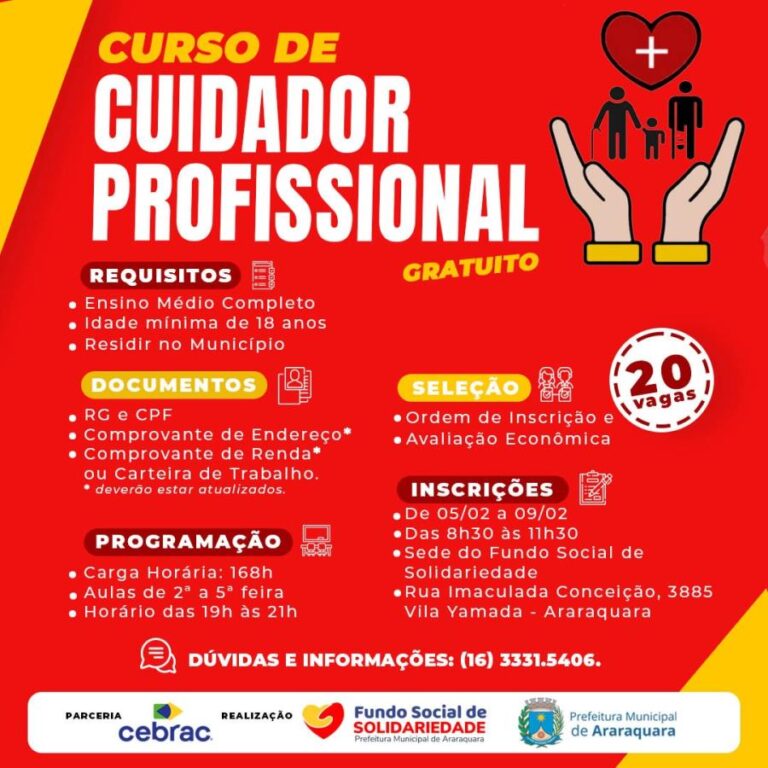 A função de cuidador profissional vem ganhando cada vez mais espaço no mercado de trabalho e é uma das profissões que mais crescem no Brasil, por isso, em uma parceria inédita, o Fundo Social de Solidariedade de Araraquara e Cebrac Araraquara trazem para a cidade, gratuitamente, o Curso de Cuidador Profissional. A capacitação é voltada […]