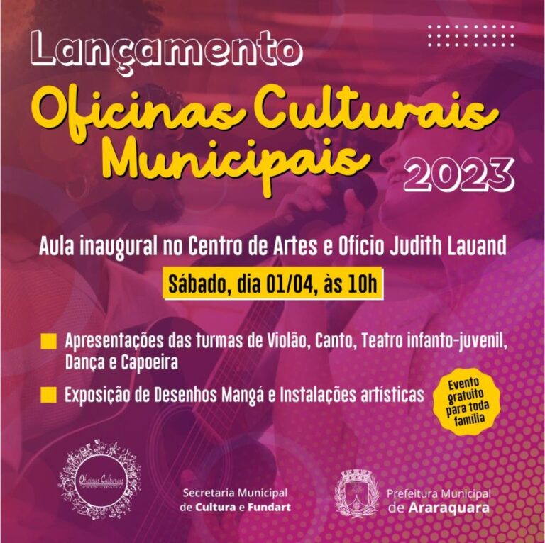Da Redação – 31/03/2023 Neste sábado, em Araraquara, acontece o lançamento do Programa Oficinas Culturais Municipais 2023 no Centro de Artes e Ofícios Judith Lauand, a partir das 10h. A atividade reúne alunos, ex-alunos, educadores, famílias e amigos para apresentações e exposições artísticas, gratuitamente. O programa, realizado pela secretaria municipal da cultura e Fundart, […]