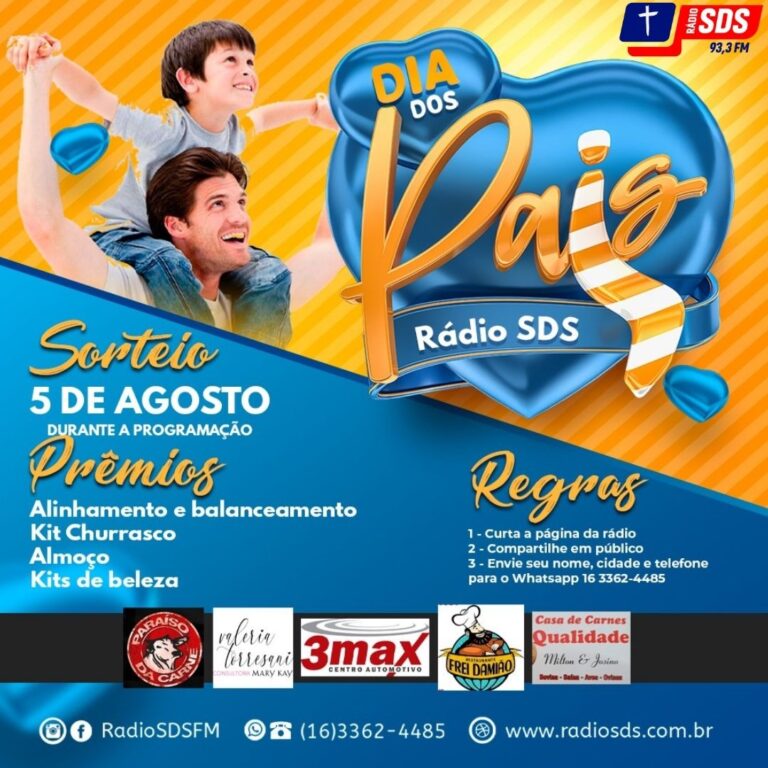 Dia dos Pais é com a Rádio SDS Mais uma promoção de sucesso para nossos ouvintes São vários prêmios para você presentear seu pai, como kit churrasco, kit de produtos masculinos, almoço de Dia dos Pais e kit alinhamento e balanceamento Para participar é fácil; Basta curtir a página da Rádio SDS, compartilhar em modo […]