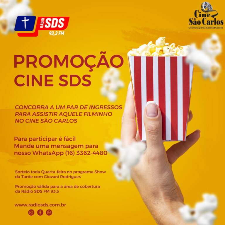 PROMOÇÃO ENCERRADA Imagine assistir os melhores lançamentos em 2 salas com ambiente higienizado e para acompanhar aquela pipoca deliciosa. Se liga aí !!! SDS FM e Cine São Carlos Apresentam: Promoção Cine SDS Toda quarta-feira você concorre a um par de ingressos para assistir aquele filminho com um acompanhante Você não vai perder essa […]