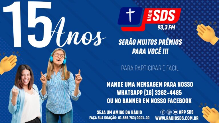 Da Redação – 05/04/2021 A Rádio SDS vai completar 15 anos neste mês de abril, e quem ganha é você ouvinte SDS, com a Promoção “15 anos SDS” Serão muitos prêmios durante a programação, entre os dias 19 a 23 de abril. Para participar é fácil, mande uma mensagem para o nosso […]