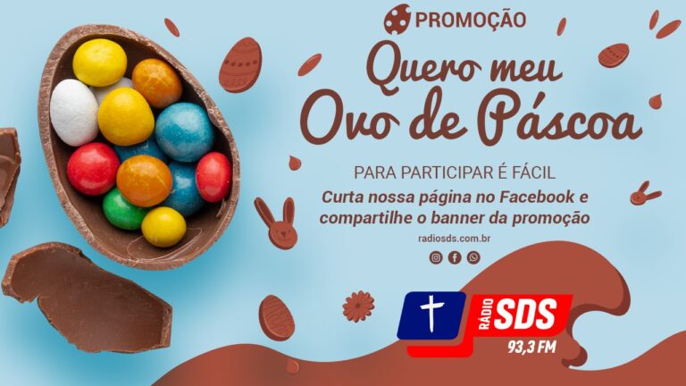 Da Redação – 08/03/2021 A Rádio SDS fm 93.3 lança a promoção “Quero meu ovo de Páscoa” Serão muitos ovos sorteados no decorrer de toda a programação. Veja como é fácil participar Curta nossa página no Facebook (facebook.com/sdsfm93.3) e compartilhe o banner em modo público.