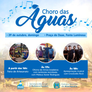 Neste domingo (29), a programação do Choro das Águas na Praça do Daae – Fonte Luminosa apresenta: feira de artesanato, oficina de ritmos brasileiros com tambores recicláveis e música com a banda Crockodilo Rock. A programação gratuita é uma realização da Prefeitura de Araraquara, por meio da Secretaria Municipal da Cultura e Fundart, com apoio do Daae Araraquara.