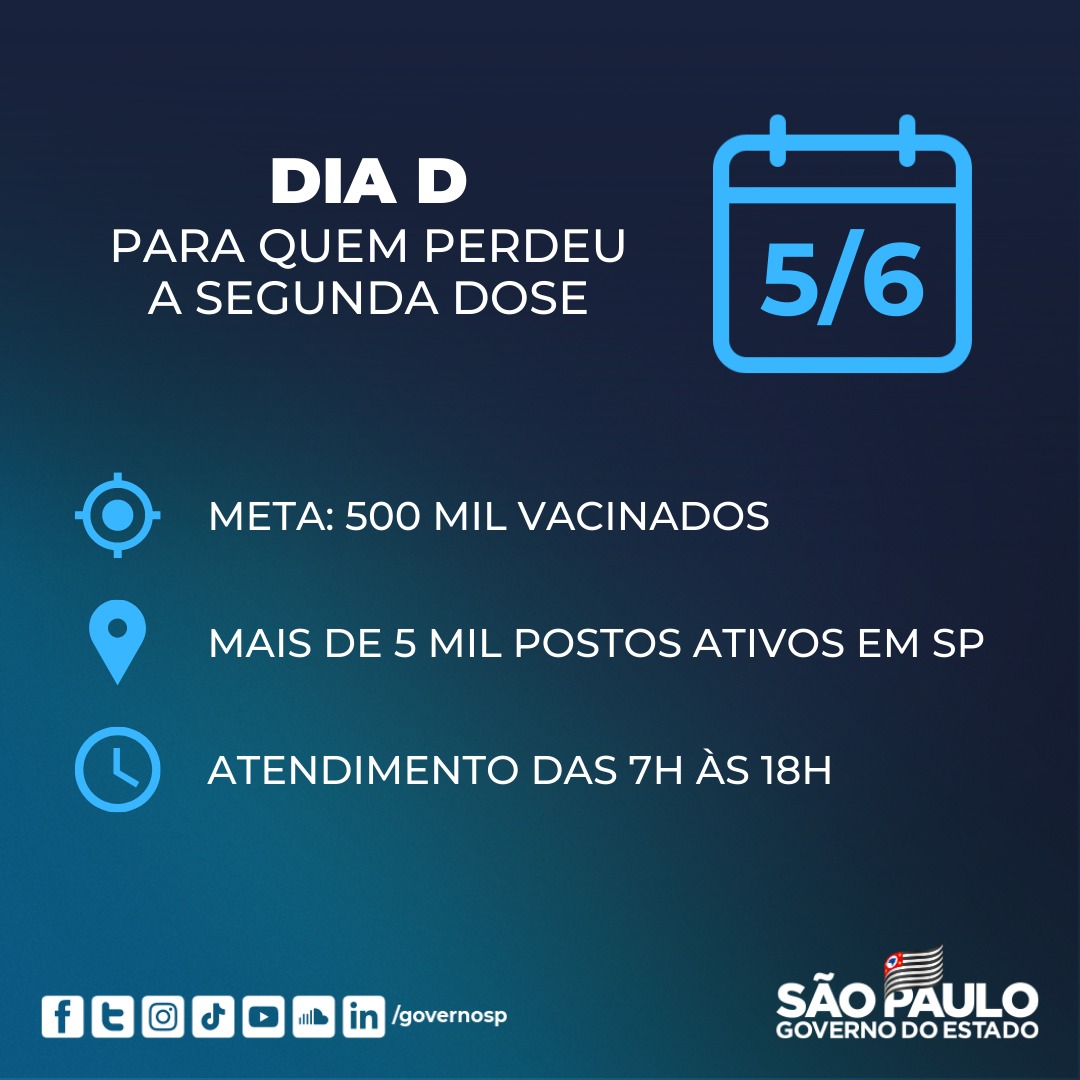 O Governo do Estado de São Paulo realiza no próximo sábado (5) o dia D para aplicação da segunda dose da vacina contra a covid-19 que está atrasada. A iniciativa busca imunizar 500 mil pessoas que não completaram seu esquema vacinal.