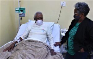 O aposentado Dioracy Bernardo, 93 anos, que precisou de transfusão de sangue, acompanhado pela sobrinha Geny Bernardo