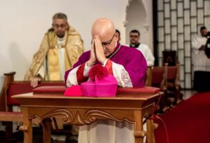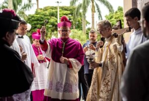 Ainda na porta o pároco da Catedral, Pe. Vilson de Castilho, ofereceu ao senhor bispo o crucifixo para ser beijado e o aspersório no qual Dom Eduardo aspergiu todos e a si mesmo. Em seguida, em procissão seguiram para a Capela do Santíssimo onde Malaspina rezou em silêncio, acompanhado do Colégio dos Consultores.