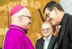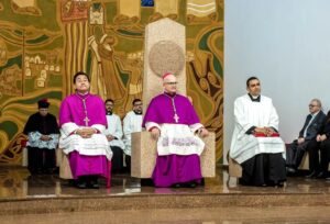Terminada a oração, se dirigiram ao presbitério onde esperavam os demais bispos presentes na cerimônia. Dom Júlio enquanto presidente da sub região pastoral de Sorocaba acolheu Dom Eduardo como bispo de Itapeva e o dirigiu a sua cátedra, a cadeira do bispo.