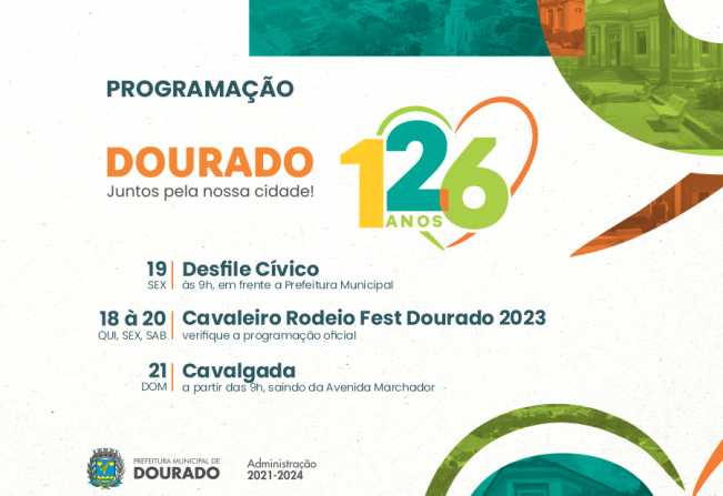 O município de Dourado completará 126 anos no dia 19 de maio! Para comemorar o aniversário da cidade, várias atividades foram programadas para receber o público douradense e da região. Na manhã de 19 de maio, haverá o tradicional Desfile Cívico, em frente a Prefeitura Municipal. De 18 a 20 de maio, o Cavaleiro Rodeio Fest trará atrações como Matheus e Kauan, Bruno e Barretto e Luana Prado (os ingressos podem ser adquiridos no site do evento).