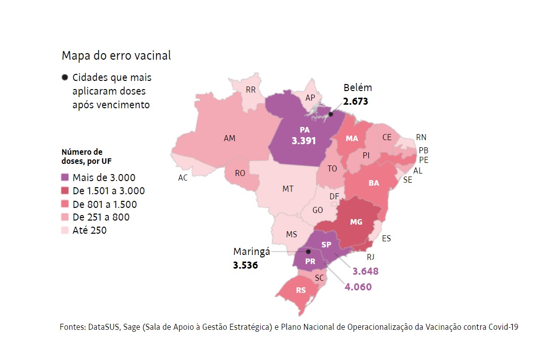 Paraná e Pará —que receberam os imunizantes desse lote em 24 de janeiro, logo depois de o primeiro lote de AstraZeneca da Índia ter chegado ao Brasil— têm a maior quantidade de registros de doses após o vencimento. Em Maringá e Belém, quase todas as doses vencidas foram ministradas especificamente nos dias 22 de abril e 11 de maio.