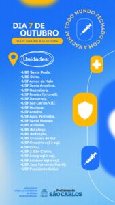 Estarão atendendo neste sábado as seguintes unidades: UBS Santa Paula, UBS Delta, USF Arnon, USF Santa Angelina, USF Guanabara, USF Tortorelli, USF Itamaraty, USF São Carlos VIII, USF Munique, USF Astolfo, USF Água Vermelha, USF Santa Eudóxia, UBS Azulville, UBS Botafogo, UBS Redenção, UBS Cruzeiro, USF Cruzeiro, USF CDHU, USF Jardim São Carlos, USF Aracy, USF Antenor, USF Petrilli e USF Collor. Estarão disponíveis todas as vacinas do calendário do Ministério da Saúde para crianças e adolescentes menores de 15 anos.