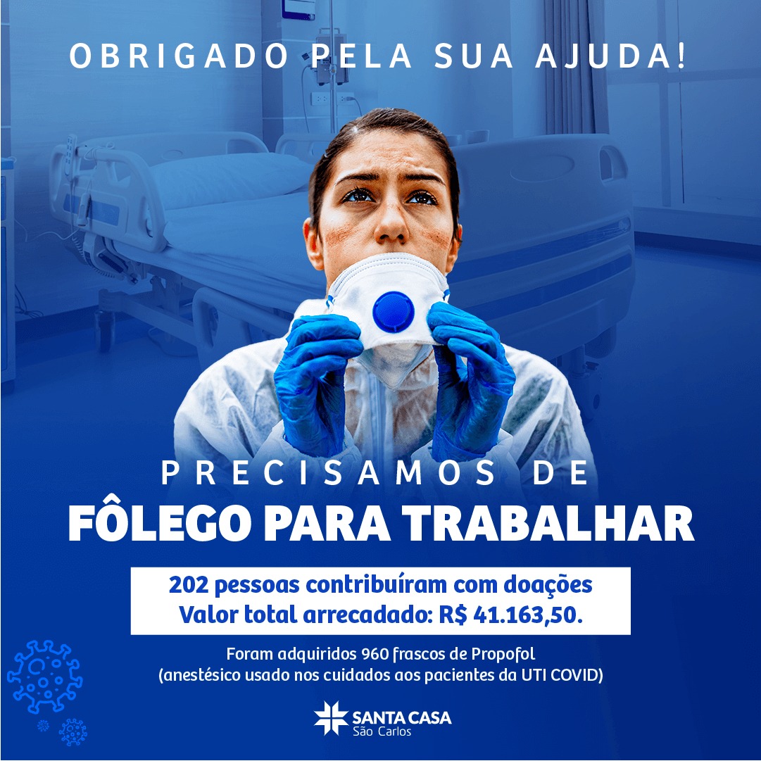 15 de junho de 2021 – O financiamento coletivo “Campanha de Arrecadação Emergencial Santa Casa de São Carlos”, feito por um grupo de amigos, arrecadou R$ 41.163,50. A campanha foi feita no mês de abril e 202 pessoas aderiram e fizeram doações para ajudar o hospital. Todo o recurso foi usado na compra de 960 frascos de Propofol, anestésico usado nos cuidados aos pacientes da UTI COVID.